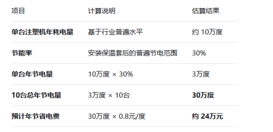 基礎(chǔ)數(shù)據(jù):一臺(tái)中型注塑機(jī)(假設(shè)功率為15kW)的年耗電量巨大。其加熱圈部分(即保溫套主要節(jié)能對(duì)象)的耗能約占整機(jī)能耗的30%-40%。