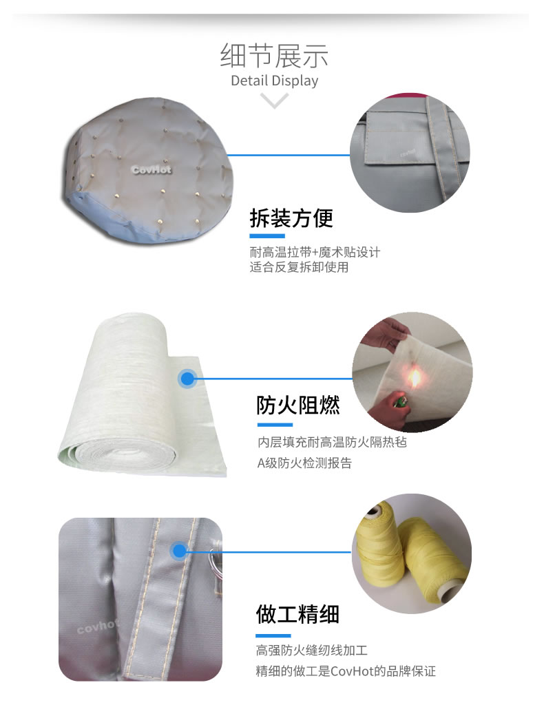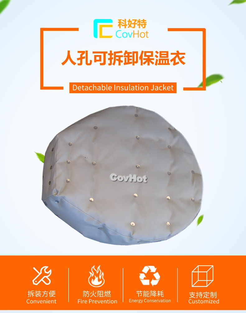 柔性可拆卸人孔保溫套采用柔軟的保溫材料設(shè)計(jì),與人孔等設(shè)備緊密結(jié)合,根據(jù)人孔的形狀量身定制,產(chǎn)品外觀整潔,不含石棉及其他有害物質(zhì),幫助工廠改善工作熱環(huán)境,可以有效防止人員燙傷。